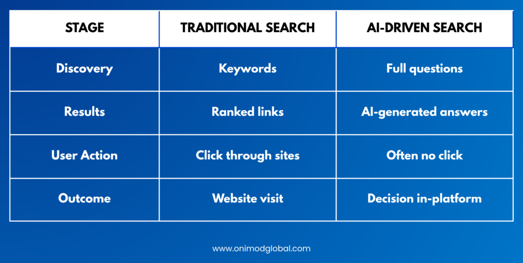 Search behavior has shifted from browsing links to receiving answers. AI-powered tools now summarize, interpret, and deliver information directly—often without a single click.