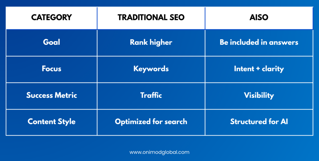 AISO (AI Search Optimization) focuses on optimizing content so it can be understood, selected, and surfaced by AI-driven search tools.