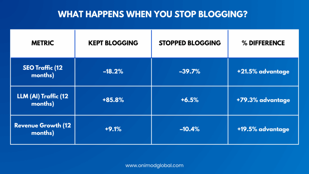 The key takeaway: Active bloggers maintain a dual advantage. They safeguard SEO authority while expanding visibility in AI-powered discovery. Those who pause risk losing traction in both arenas, and regaining it can take months—or even years.